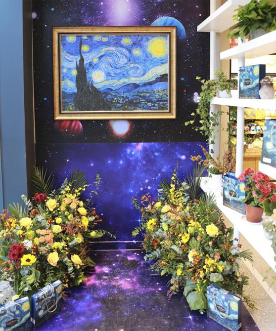 同時,休閑區(qū)的墻面布置成梵高星空圖,與線上熱賣的雙十一定制新品——梵高IP九味星球酥呼應(yīng),在店內(nèi)掃二維碼,就能進(jìn)入電商平臺購買。如此線上線下結(jié)合,共同端出了一份歐式下午茶。
