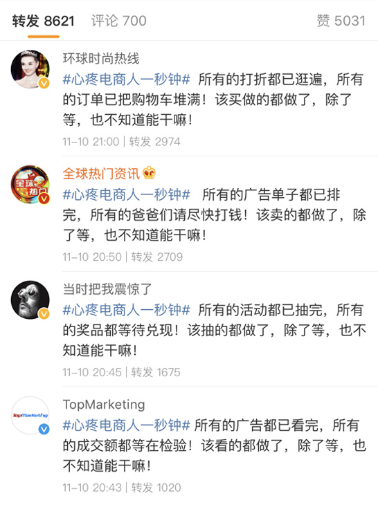 在這樣一個全民屏息等零點的狀態(tài)下,任何與雙十一相關的內容都有可能引起用戶的轉發(fā)熱情。