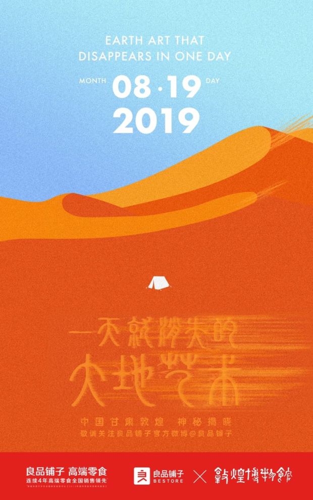 8月19日,良品鋪子還將在敦煌沙漠演繹了一場“只存在一天的大地藝術(shù)”。敦煌沙漠上會出現(xiàn)一幅精美的大地沙畫,忽然風(fēng)沙起,美好的景象頃刻間流逝。年輕的藝術(shù)家們近一周的創(chuàng)作,用“沙畫”的形式再現(xiàn)經(jīng)典敦煌壁畫,希望通過再現(xiàn)沙畫風(fēng)化消逝的過程呼吁更多關(guān)注和保護敦煌文化。